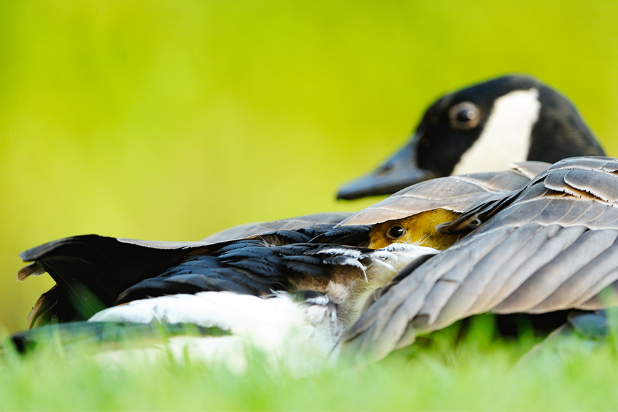 Breeding as early as January, long before other geese, they’re known to nest in cavities in old trees or under bushes or on islands. Between 6 – 12 eggs will be laid and after around 30 days of being incubated by both the male and female, they hatch and these tiny goslings emerge. Look for small, downy black and white patterned chicks following their mother.