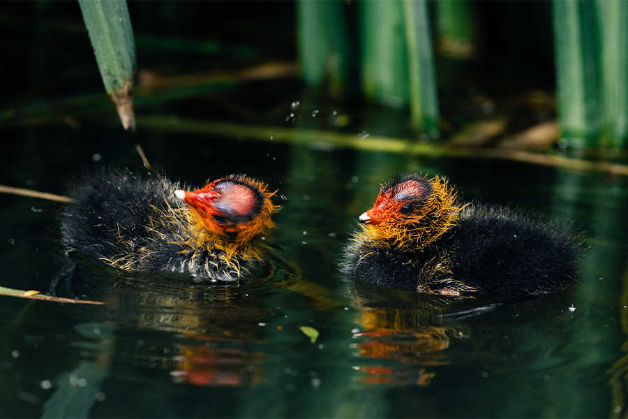 They lay around 5 – 9 eggs in a clutch and have even been known to lay eggs in the nests of other coots – a form of ‘conspecific brood parasitism’. Keep your eyes open for these red-faced chicks on ponds, lakes, canals, and other wetland habitats from March onwards.