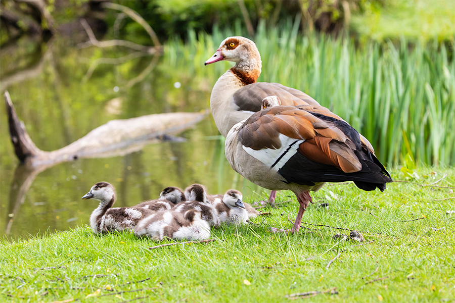 The earliest goslings to appear are those of the Egyptian goose. These unmistakable birds have a cream body with brown wings, pink legs and beak and a brown patch around their eye making them stand out from other goose species.
