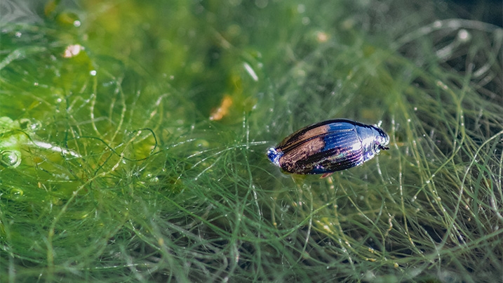 Hundreds of diving beetle species inhabit the UK. The largest is the great diving beetle. Green-black in colour, they feed on invertebrates, tadpoles and small fish. Look for them visiting the water’s surface to resupply air, which they store beneath their wing cases.