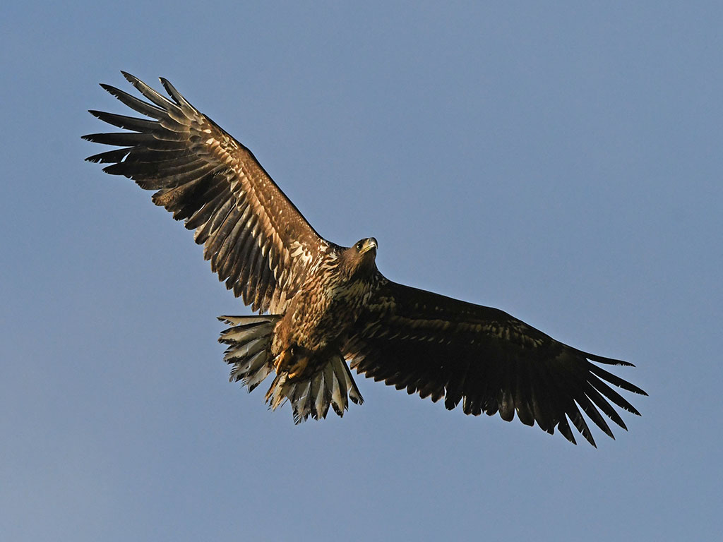 The white-tailed eagle is the UK’s largest bird of prey, boasting an impressive eight-foot wingspan. Adults are striking, with a pale head and neck, and the iconic white wedge-shaped tail that gives them their name.