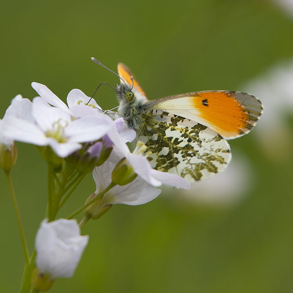 Footpaths between hides are full of orange tip butterflies in spring where their favourite food plants cuckoo flower and garlic mustard grow.